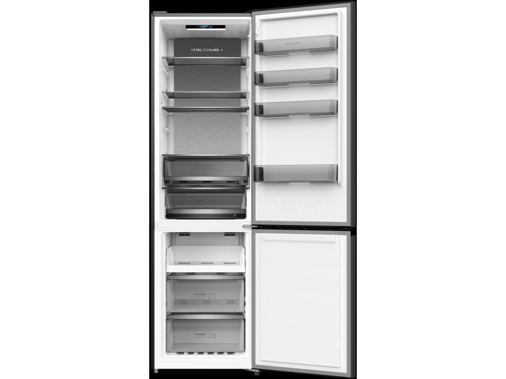 S celkovým objemem 405 litrů, z toho 285 litrů v chladicí části a 120 litrů v mrazicí části, nabízí Brandt BFC2066AD dostatek prostoru pro veškeré vaše potraviny. Chladicí část obsahuje Fresh zónu pro čerstvé potraviny, tři police z bezpečnostního skla a dvě zásuvky na ovoce a zeleninu. Mrazicí část je vybavena třemi objemnými šuplíky a formou na ledové kostky.