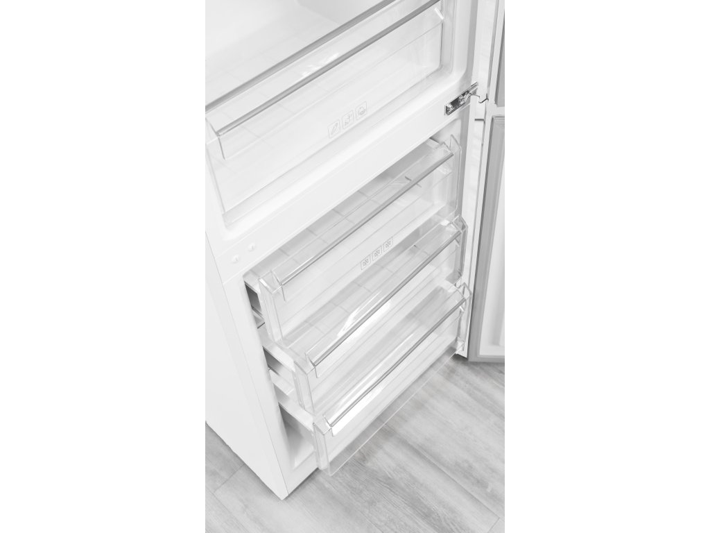 Volně stojící kombinovaná Total No Frost chladnička s mrazákem dole v elegantním bílém provedení. Tento model se řadí do energetické třídy D a klimatické třídy N-ST. S hlučností pouze 39 dB je velmi tichým přístrojem. Chladnička nabízí celkový objem 293 litrů a disponuje elektronickým řízením kontroly teploty s mechanickým ovládáním. Možnost změny směru otevírání dveří. V případě výpadku proudu chladnička vydrží až 8,5 hodin bez napájení. Roční spotřeba energie činí 186 kWh. Rozměry jsou (VxŠxH): 186 x 60 x 60 cm a hmotnost 58 kg.