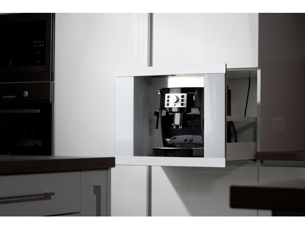 - Vestavná schránka s teleskopickým výsuvem pro volně stojící kávovary.