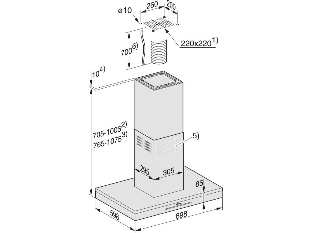 | Celková výška odsavače par v cirkulačním provozu v mm: | 765–1075 |