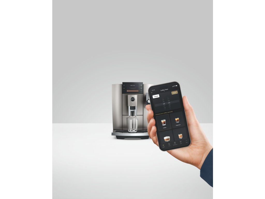 JURA E8 disponuje inteligentní technologií Coffee Timer. Díky ní lze pomocí aplikace J.O.E.® naprogramovat ranní kávu a vychutnat si ji čerstvě namletou a připravenou hned po probuzení. Pro tuto funkci je třeba doplnit kávovar o JURA WiFi Connect. Jedná se o volitelné příslušenství, které lze samostatně dokoupit. Aplikace JURA Operating Experience (J.O.E.®) je volně dostupná ke stažení / instalaci na Google Play a v App Store. Díky ní můžete s kávovarem komunikovat přes váš chytrý telefon nebo tablet.