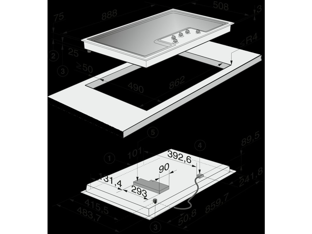 | Rozměry výřezu (š x h) při instalaci bez rámečku na pracovní desku v mm: | 862 mm x 490 mm |
