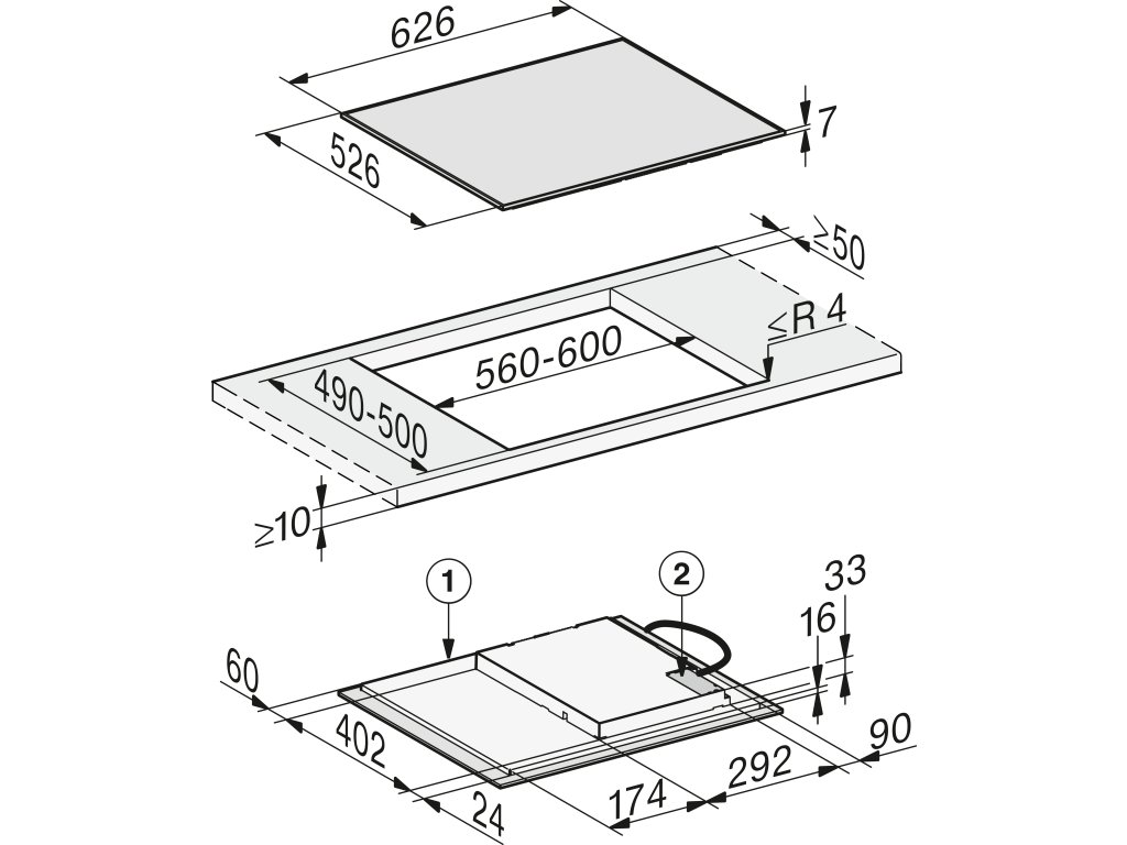 | Rozměry výřezu (š x h) při instalaci bez rámečku na pracovní desku v mm: | 600 mm - 600 mm x 490 mm - 500 mm |