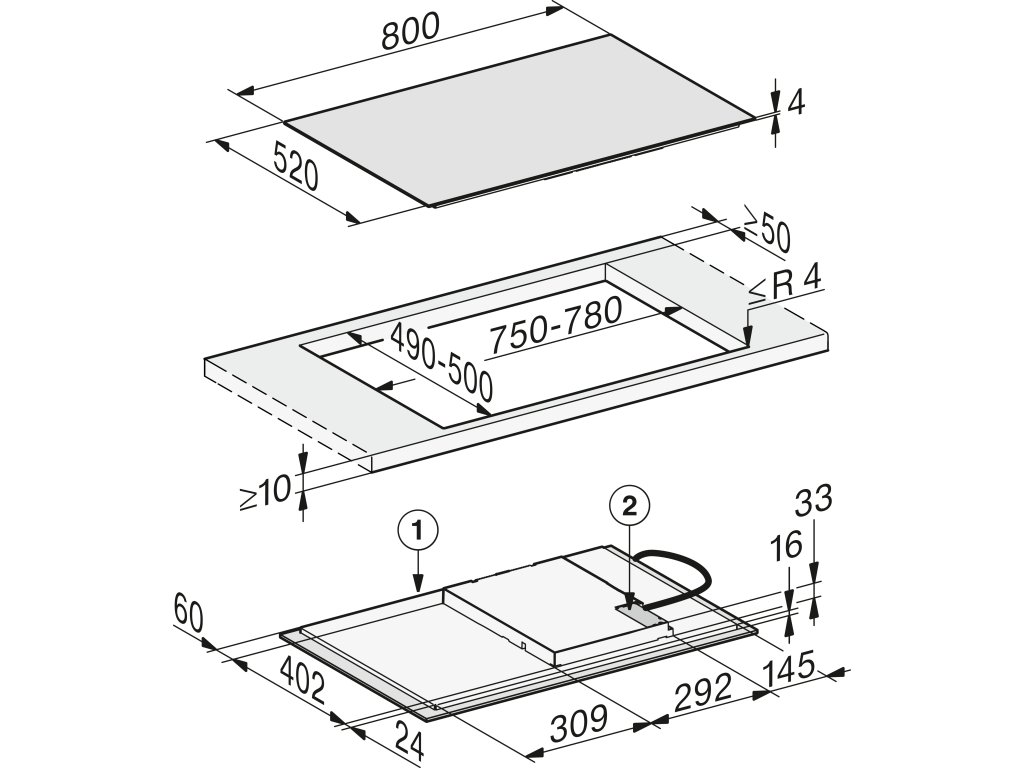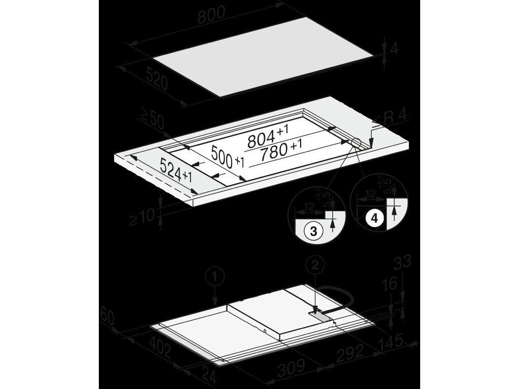 | Rozměry výřezu (š x h) při instalaci se zapuštěním do pracovní desky v mm: | 780/804 x 500/524 |