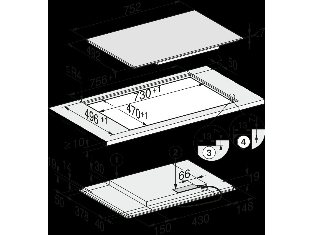 | Rozměry výřezu (š x h) při instalaci se zapuštěním do pracovní desky v mm: | 730/756 x 470/496 |