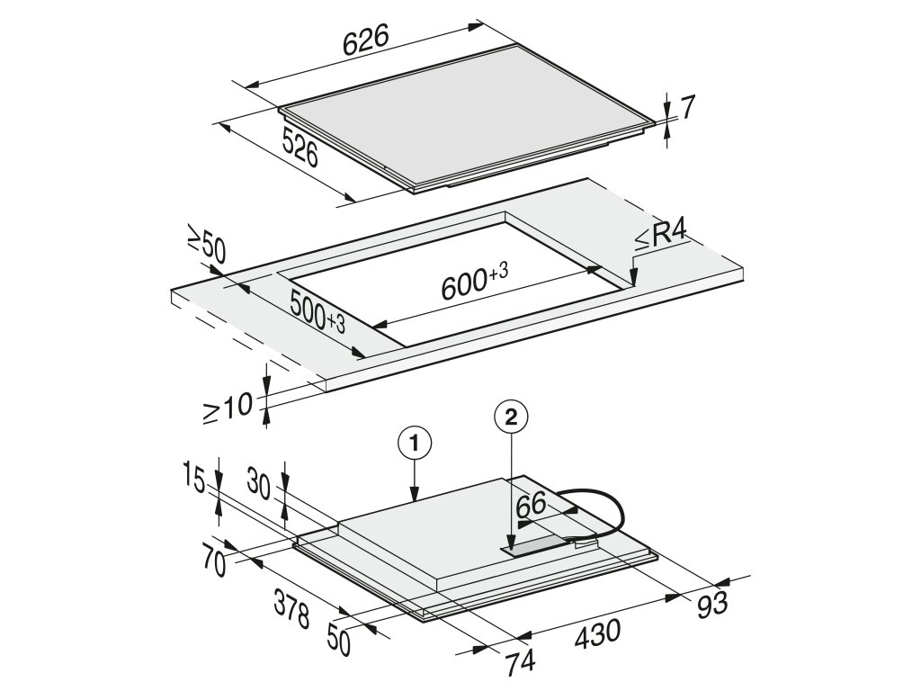 | Rozměry výřezu v mm (hloubka) při instalaci bez rámu na pracovní desku: | 500 mm |