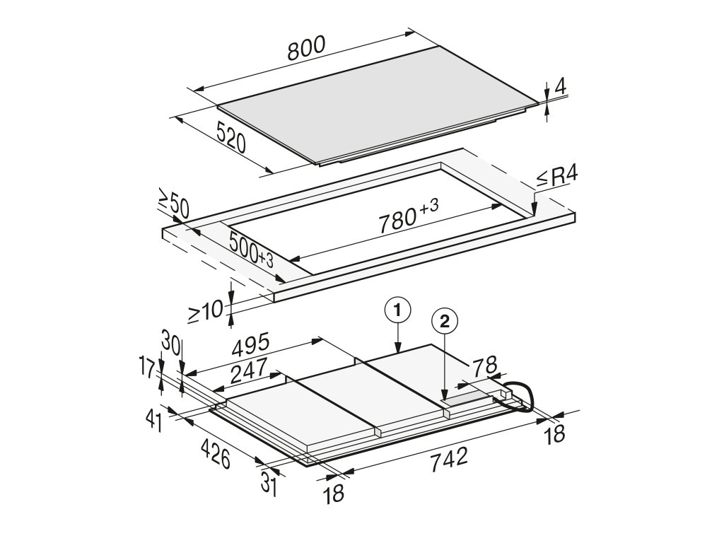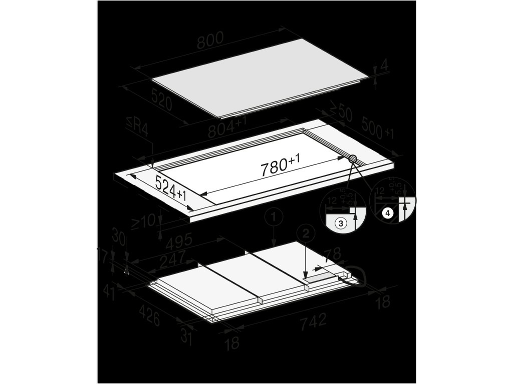 | Rozměry výřezu (š x h) při instalaci se zapuštěním do pracovní desky v mm: | 780/804 x 500/524 |