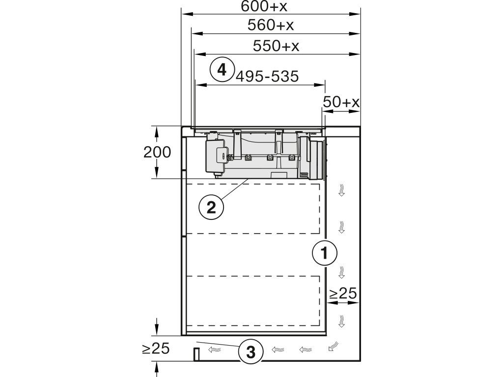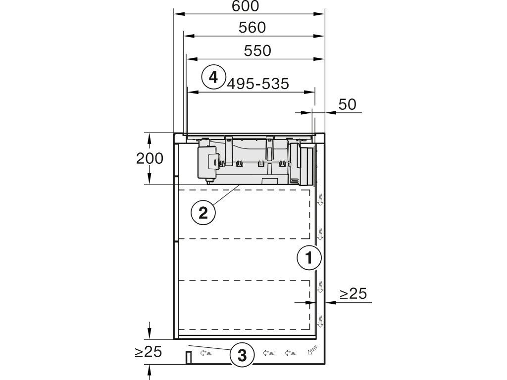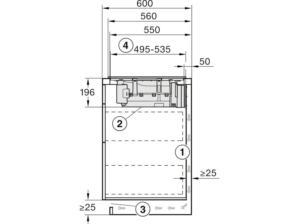 | Vnitřní rozměr výřezu v mm (hloubka) při instalaci se zapuštěním do pracovní desky: | 500 |
