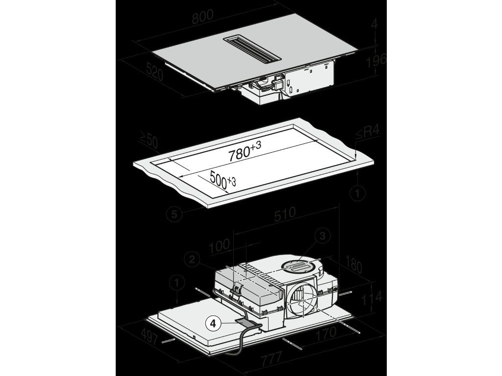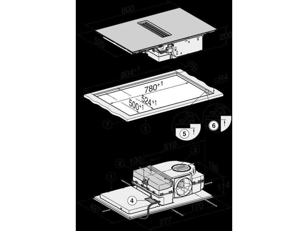 | Rozměry výřezu v mm (šířka) při instalaci bez rámu na pracovní desku: | 780 mm |