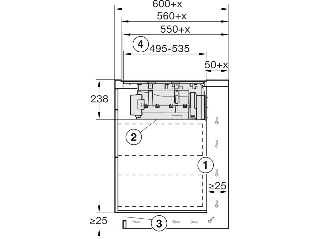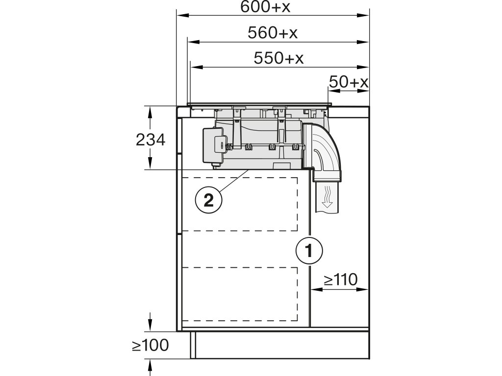 | Vnitřní rozměr výřezu v mm (hloubka) při instalaci se zapuštěním do pracovní desky: | 500 |