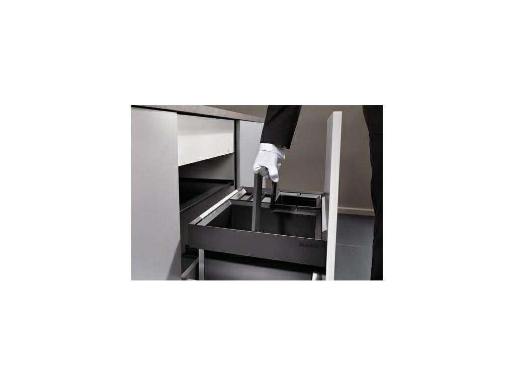 - Při plánování výšky zabudování odpadu zohledňujte výšku podesty zásuvkové skříňky, hloubku zabudování u dřezu s odtokovou sadou a z toho vyplývající nejnižší míru spodní skříňky.