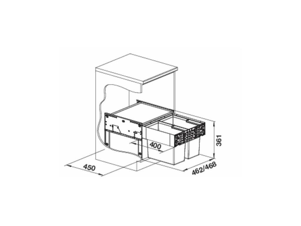 • Výška montáže 361 mm, hloubka montáže 400 mm, potřebná vnitřní velikost skříňky (hloubka) 450 mm.