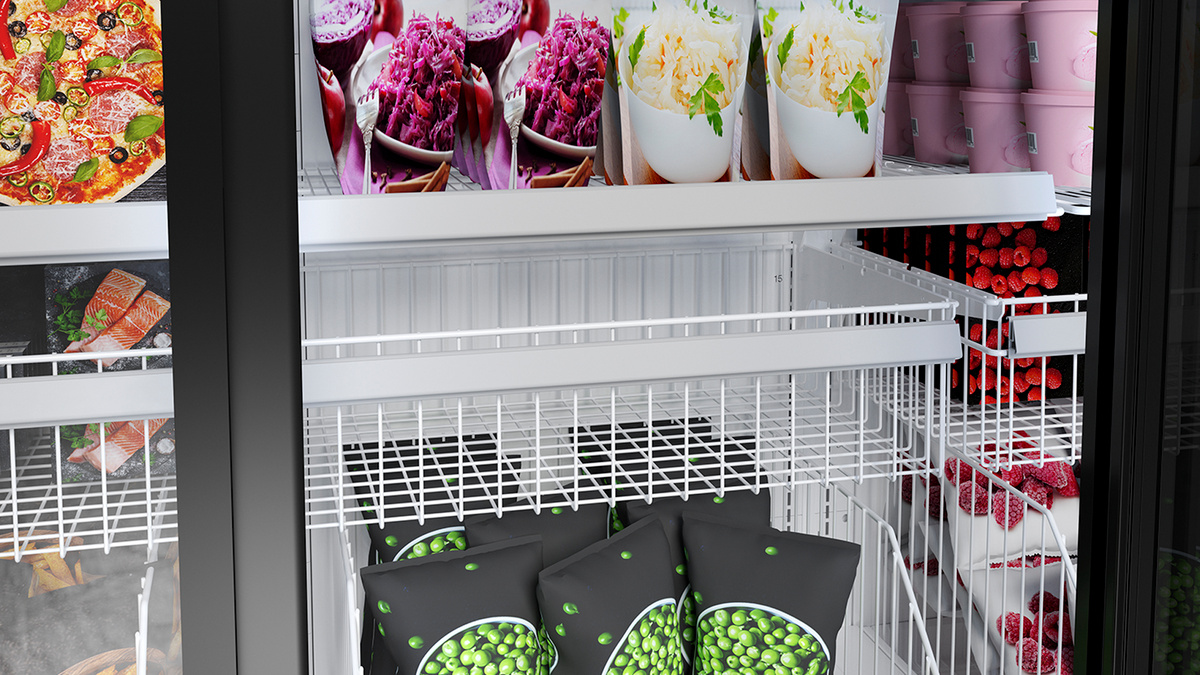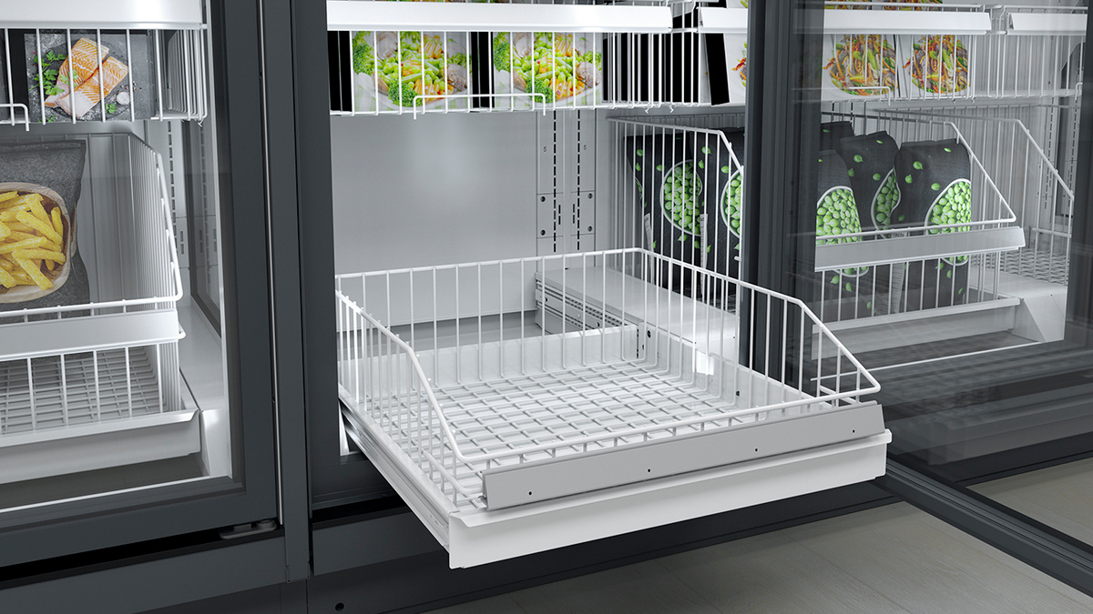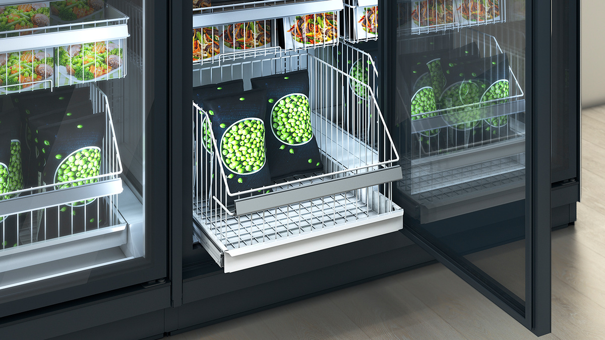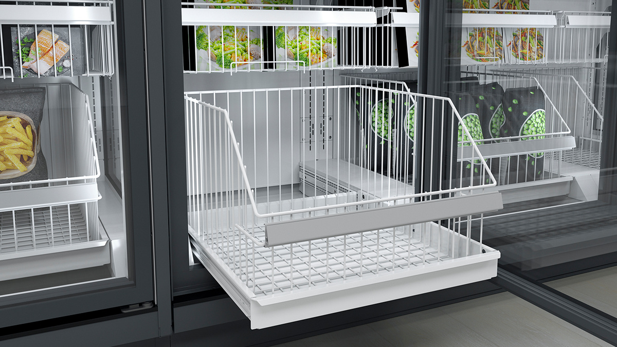 Do mrazničky s plně prosklenými dveřmi lze ideálně umístit každý produkt. K atraktivní prezentaci menších produktů lze využít menší koš, který se umístí nad ten velký. Navíc tak bude zajištěn dostatek prostoru pro produkty v sáčcích.