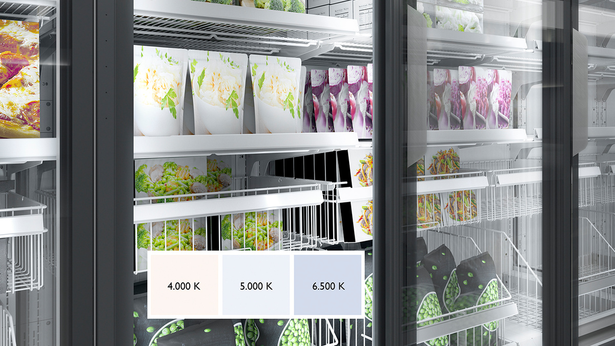 LED osvětlení mrazničky s plně prosklenými dveřmi je dostupné v barevných teplotách 4000 K, 5000 K a 6500 K. Mražené zboží tak budete prezentovat v tom nejlepším světle.