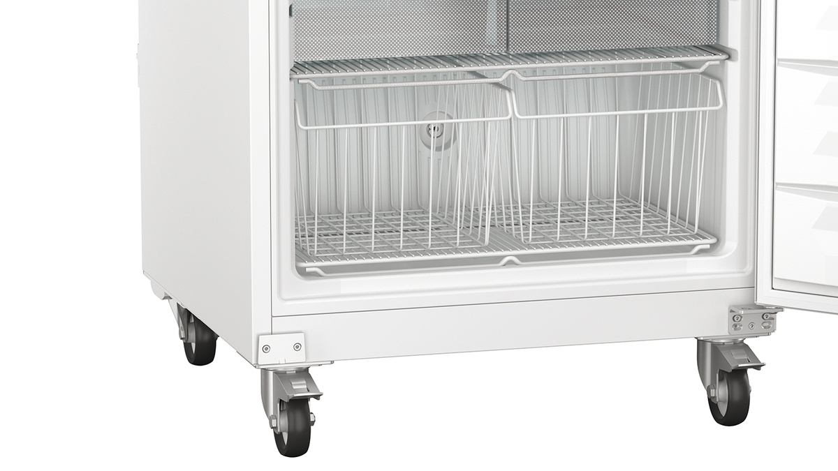 S dodatečně namontovanými kolečky zůstává profesionální vybavení pro skladování produktů citlivých na teplotu extrémně mobilní. Díky tomu můžete kdykoli změnit místo instalace nebo jednoduše přemístit spotřebič pro snadnější čištění.