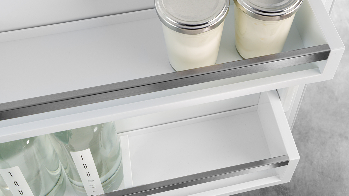 Pokud v chladničce skladujete karafu nebo vysoké nádoby, nemusíte k tomu účelu odstraňovat hned celou skleněnou desku. Proč také? K dispozici je dělitelná skleněná deska: Jednoduše zasunete přední polovinu skleněné desky pod její zadní polovinu. Vpředu tak můžete postavit větší nádoby a stále budete mít dostatek místa pro další potraviny.
