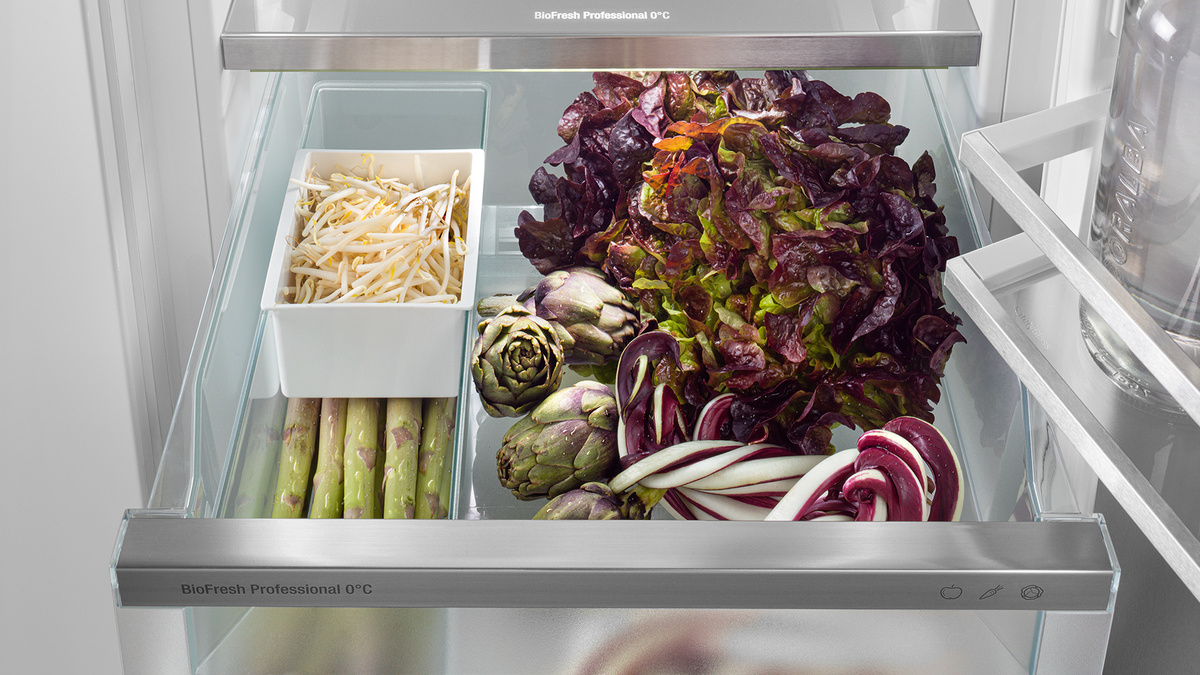 Křupavý salát nebo jahody: Nejcitlivější potraviny si zaslouží zvláštní místo, aby zůstaly déle čerstvé: Přihrádky BioFresh. V přihrádce na ovoce a zeleninu se teplota blíží 0 °C. V kombinaci s vlhkostí vzduchu, která v této přihrádce převládá, a díky jejímu těsnému uzavření je zde nebalenému ovoci a zelenině obzvláště dobře. Nemusíte nic nastavovat.