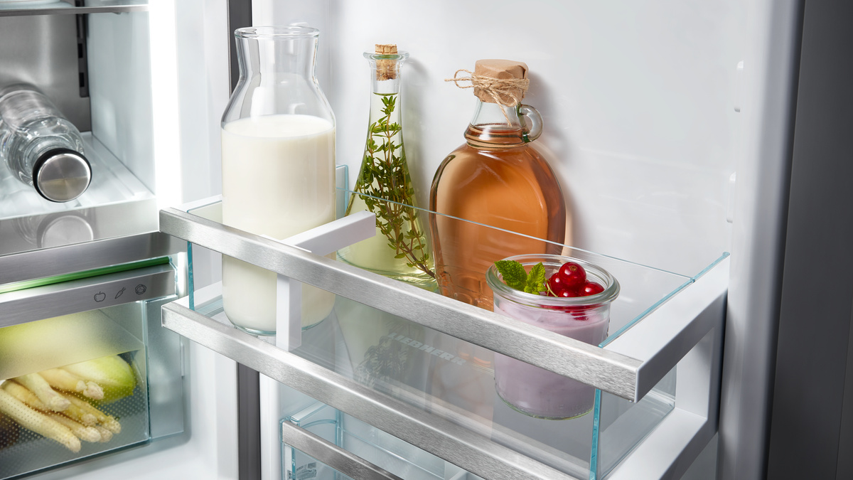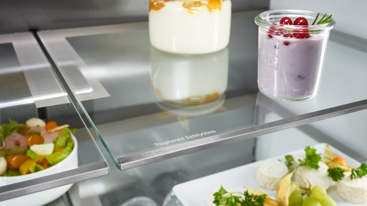 Čisté, světlé a atraktivní – tento dojem budete mít při každém otevření svého spotřebiče Liebherr. To zajišťují mimo jiné transparentní skleněné desky z bezpečnostního skla. Jejich výšku můžete rychle a snadno nastavit jediným pohybem. Atraktivní vzhled dotvářejí ozdobné lišty z nerezové oceli.