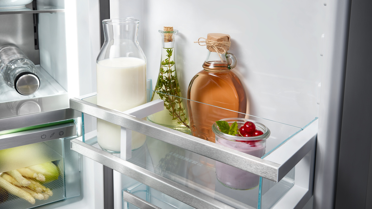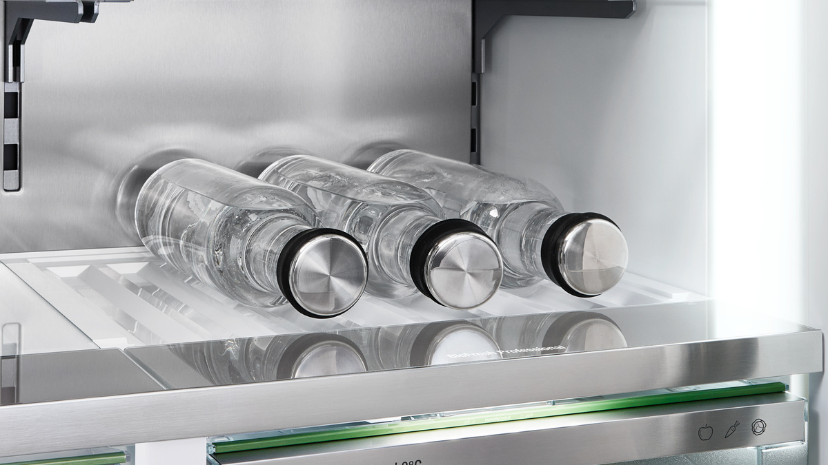 Čekáte hosty a chcete vychladit o pár lahví nápojů víc než obvykle? K tomu účelu je k dispozici polička na lahve nad přihrádkou BioFresh. Jedním pohybem ruky jednoduše vyjmete skleněnou desku nad poličkou na lahve – a již můžete bezpečně skladovat a chladit lahve různých velikostí.
