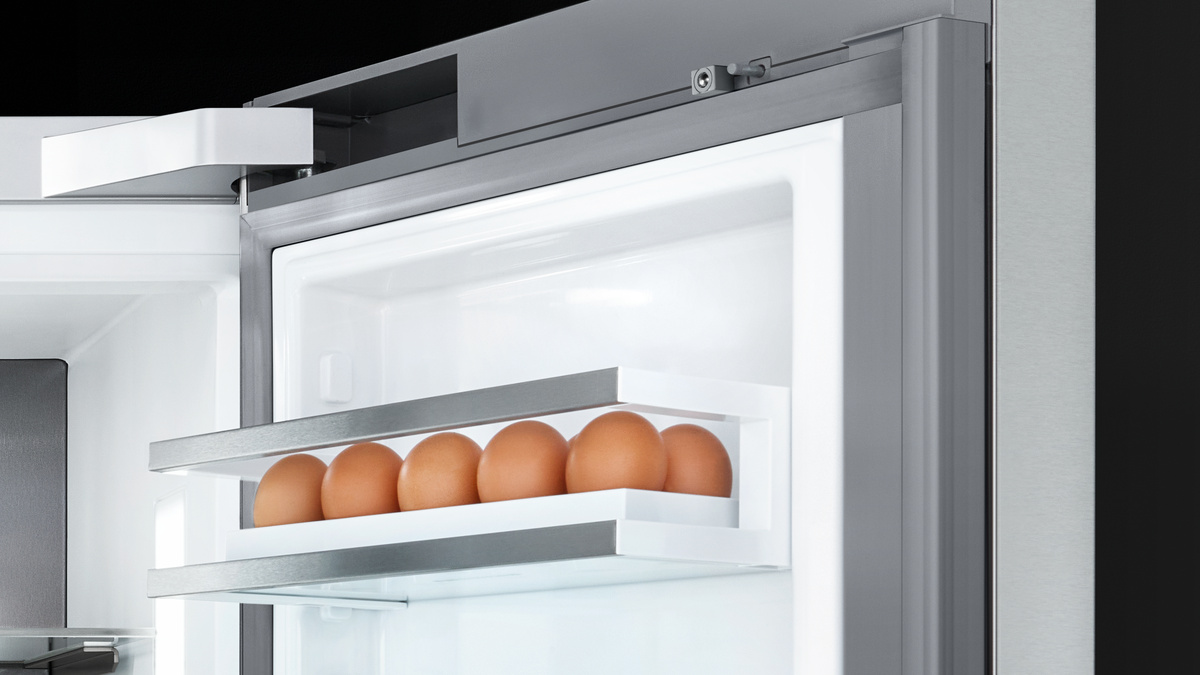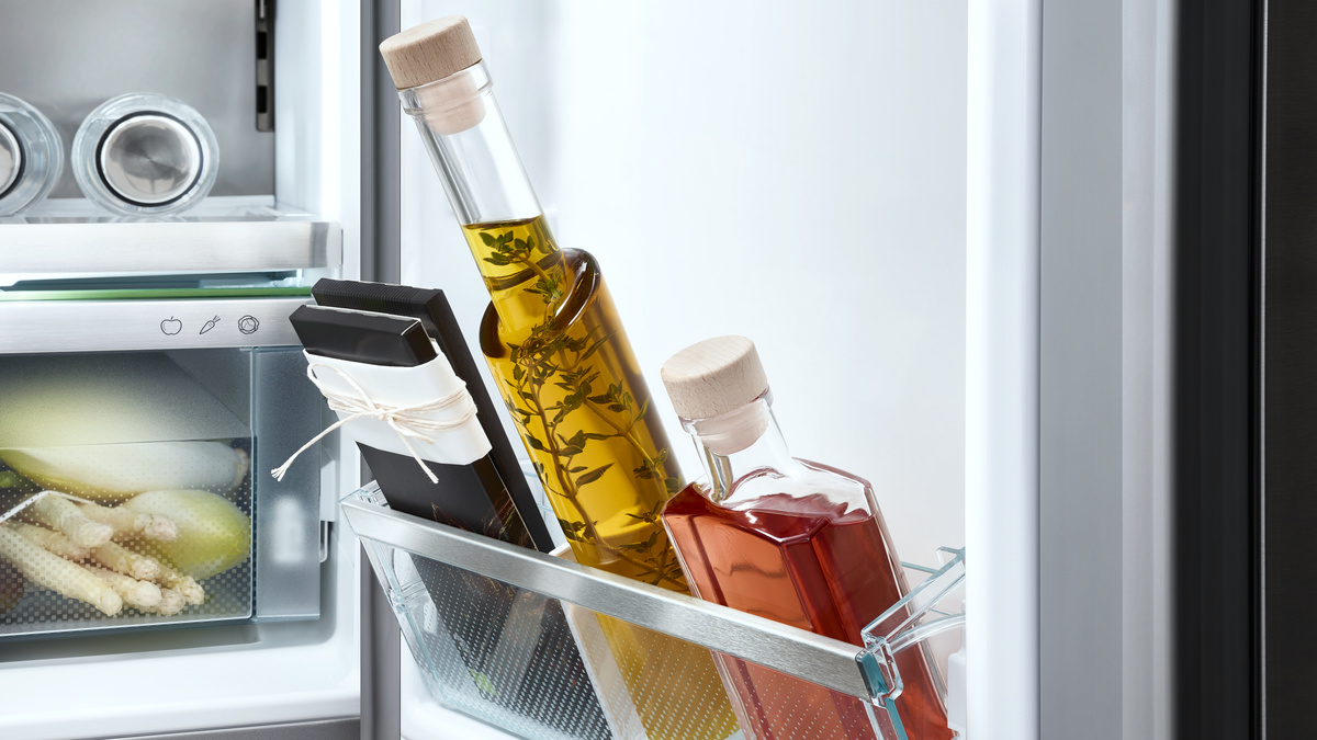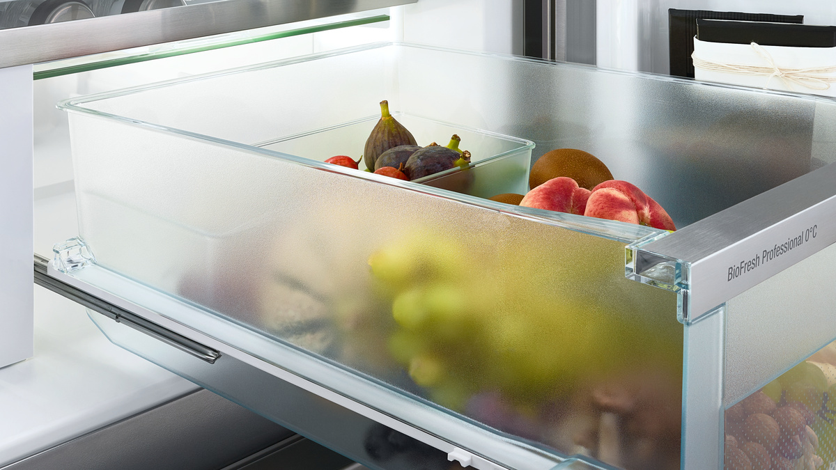 Těšte se na otvírání přihrádek BioFresh. Nejen kvůli čerstvým potravinám – ale také proto, že otevírání je tak snadné a zavírání je automatické a tlumené. Zajišťují to teleskopické kolejničky, na kterých vám přihrádky hladce pojedou naproti. A protože přihrádky úplně vyjedou, budete mít nejlepší přehled o jejich obsahu.
