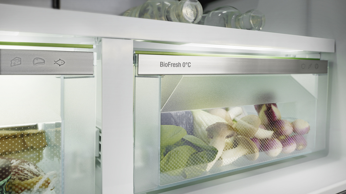 Užijte si dlouhodobou čerstvost a flexibilní skladování: Přihrádky BioFresh udržují ideální klima těsně nad 0 °C. Klíčové vlastnosti: Uzavřením těsnicího víka zvýšíte vlhkost a prodloužíte čerstvost ovoce a zeleniny. Masné a mléčné výrobky se oproti tomu skvěle skladují s otevřeným víkem a nižší úrovní vlhkosti.