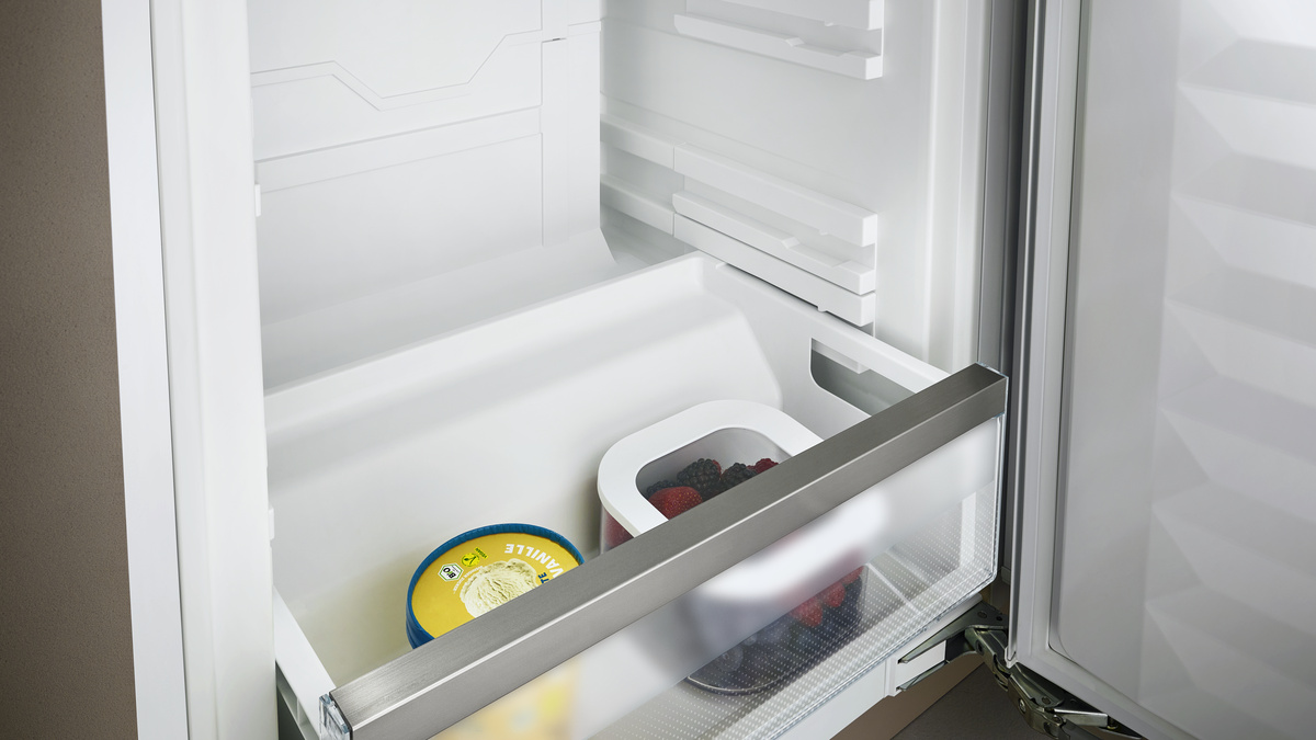 Poznejte pohodlí integrovaných kolejnic pro zásuvky mrazničky. Tyto koleje zajišťují hladké posouvání zásuvek, a tím předcházejí poškrábání a zároveň poskytují dodatečné vedení a bezpečnost. Zásuvky se zarážkou proti vytažení zůstávají stabilní a ani při úhlu otevření dveří 90° nevypadnou a nenaklání se. Využijte bezproblémový přístup k vašim mraženým produktům.