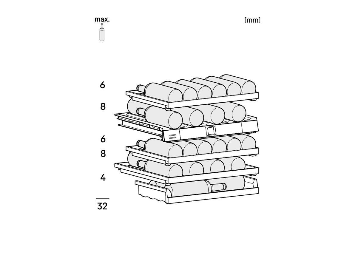 | Maximální kapacita lahví Bordeaux (0,75 l): | 32 |