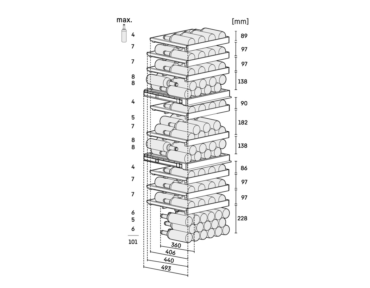 | Maximální kapacita lahví Bordeaux (0,75 l): | 104 |