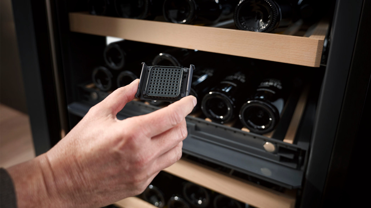 Aby vaše víno mohlo dozrávat v prostředí s optimální kvalitou vzduchu, jsou všechny temperovací vinotéky Liebherr vybaveny filtrem s aktivním uhlím, který spolehlivě váže všechny druhy pachů. Vína si tak zachovají svůj originální buket. A aby tuto skutečnost nic neohrozilo ani z dlouhodobého hlediska, spotřebič Liebherr vás každých 6 měsíců upozorní na nutnost výměny filtru, kterou hravě zvládnete sami.