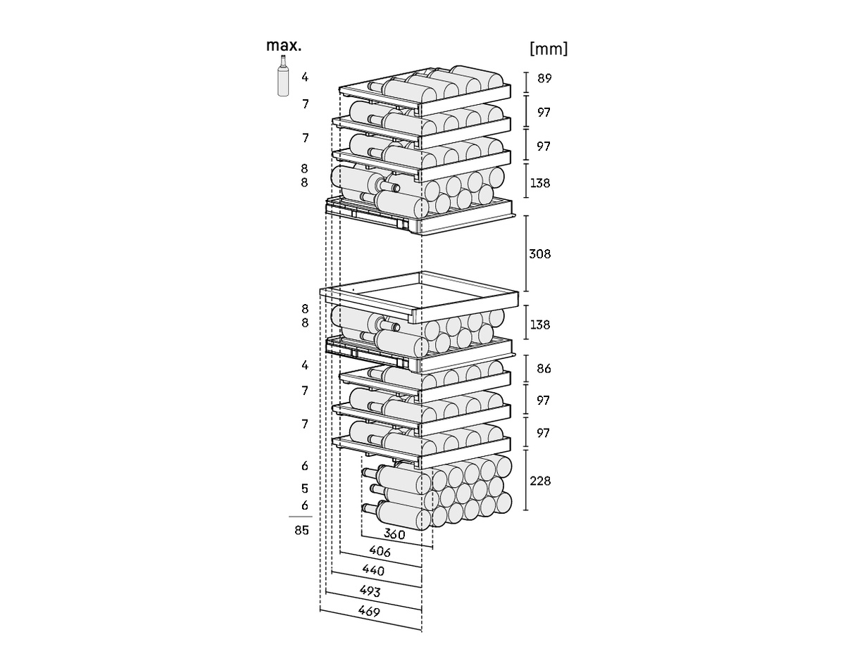 | Maximální kapacita lahví Bordeaux (0,75 l): | 85 |