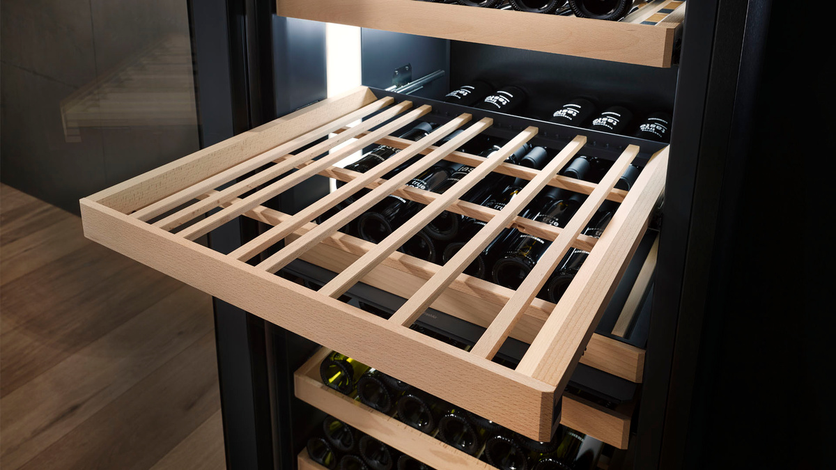 Zkoumání vaší sbírky vín je nyní ještě zábavnější. Důmyslně vytvořené měkké teleskopické kolejnice chladniček z řady Vinidor zajišťují plynulé vysouvání a zasouvání držáků na víno, které vaše víno co nejméně omezují a přitom ho máte pohodlně po ruce – a vy se tak můžete sami rozhodnout pro to, na které máte chuť.