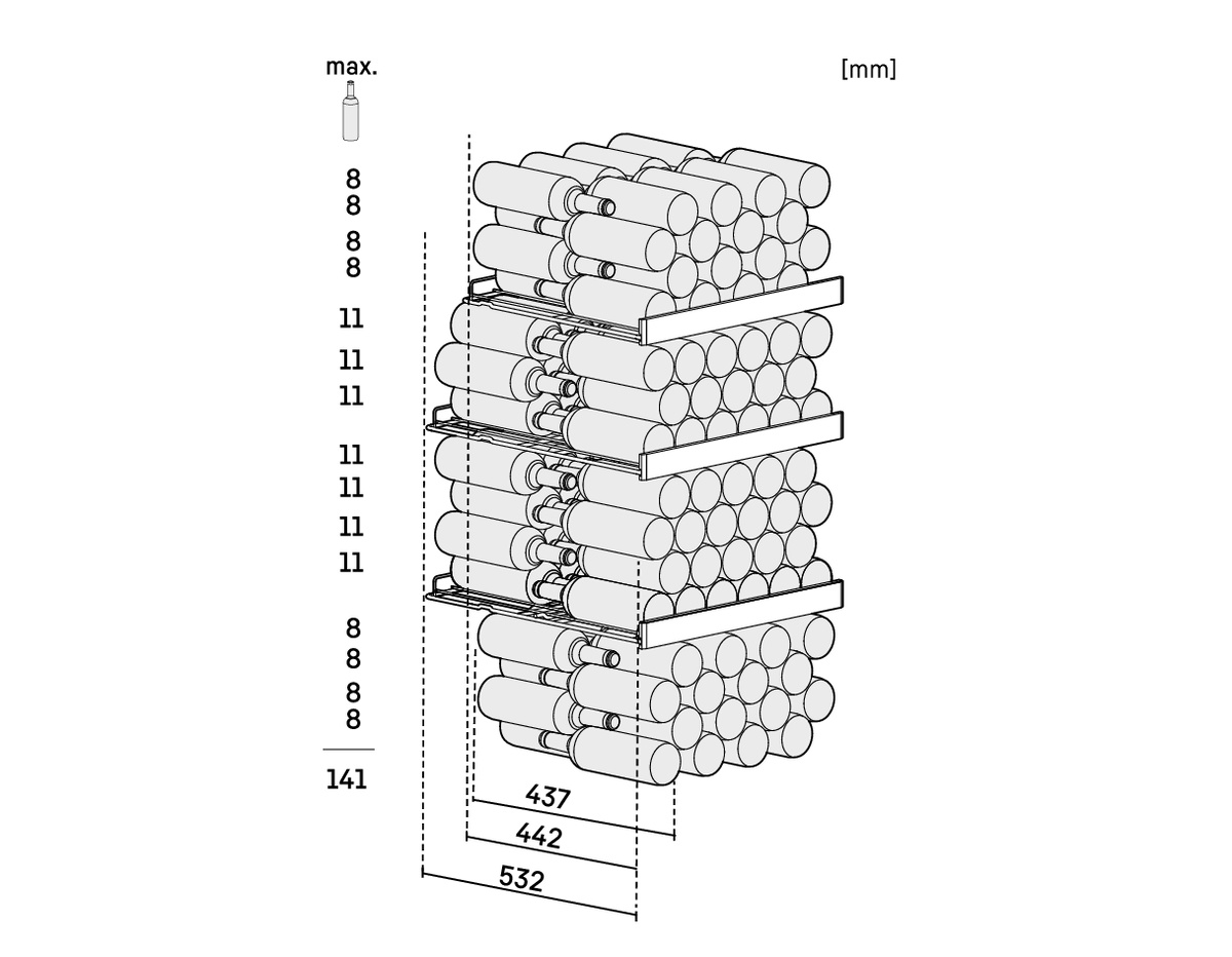 | Maximální kapacita lahví Bordeaux (0,75 l): | 141 |