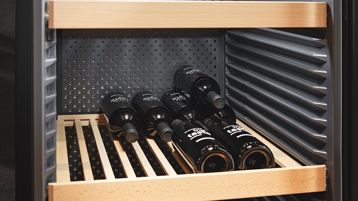 Promyšlené a propracované. Elegantní police vyrobené z bukového dřeva jsou navrženy pro vodorovné uložení vín bez působení vibrací a díky ergonomickému tvaru lze láhve snadno zasouvat, vytahovat i přeskládat. Další výhodou je skutečnost, že dřevo dýchá a dokáže uložit menší množství vody, což je dobré pro mikroklima uvnitř a tedy i pro dlouhodobé skladování.