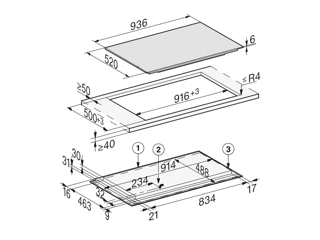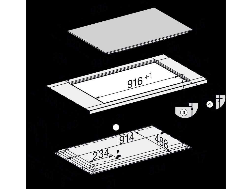 | Rozměry výřezu (š x h) při instalaci se zapuštěním do pracovní desky v mm: | 916/940 x 500/524 |