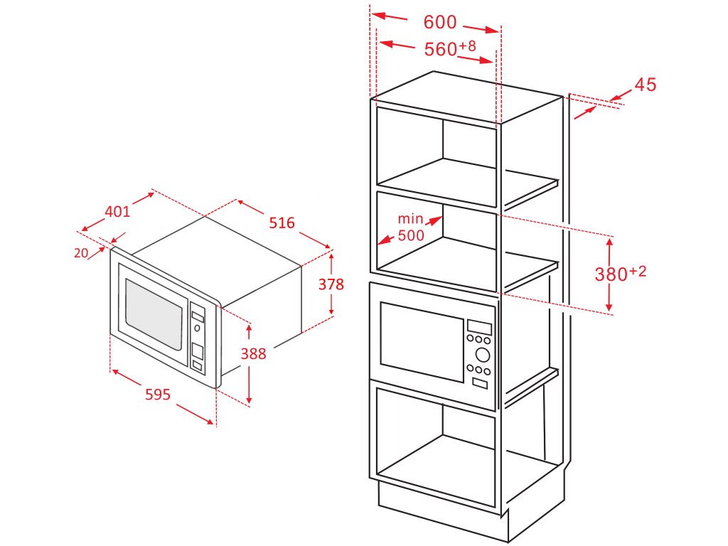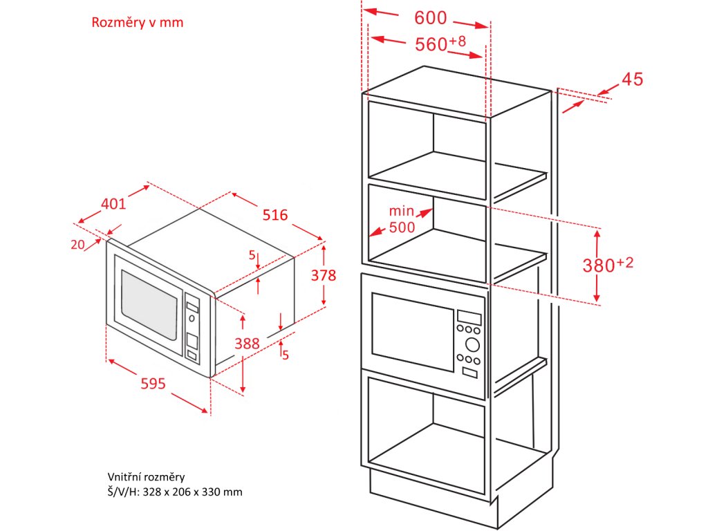 Rozměry vnitřního prostoru trouby jsou 20,6 x 32,8 x 33 cm a vnější rozměry 38,8 x 59,5 x 40,1 cm, což umožňuje snadnou vestavbu do standardních otvorů v kuchyňské lince.