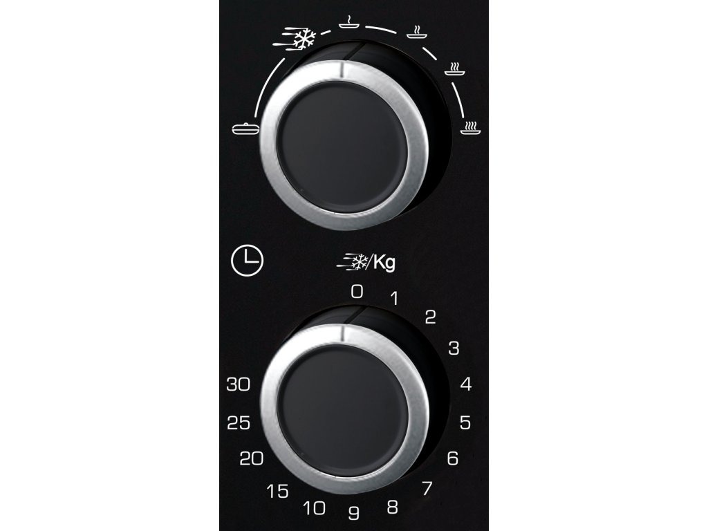 - Mechanické ovládání výkonu a času ohřevu pomocí otočných voličů