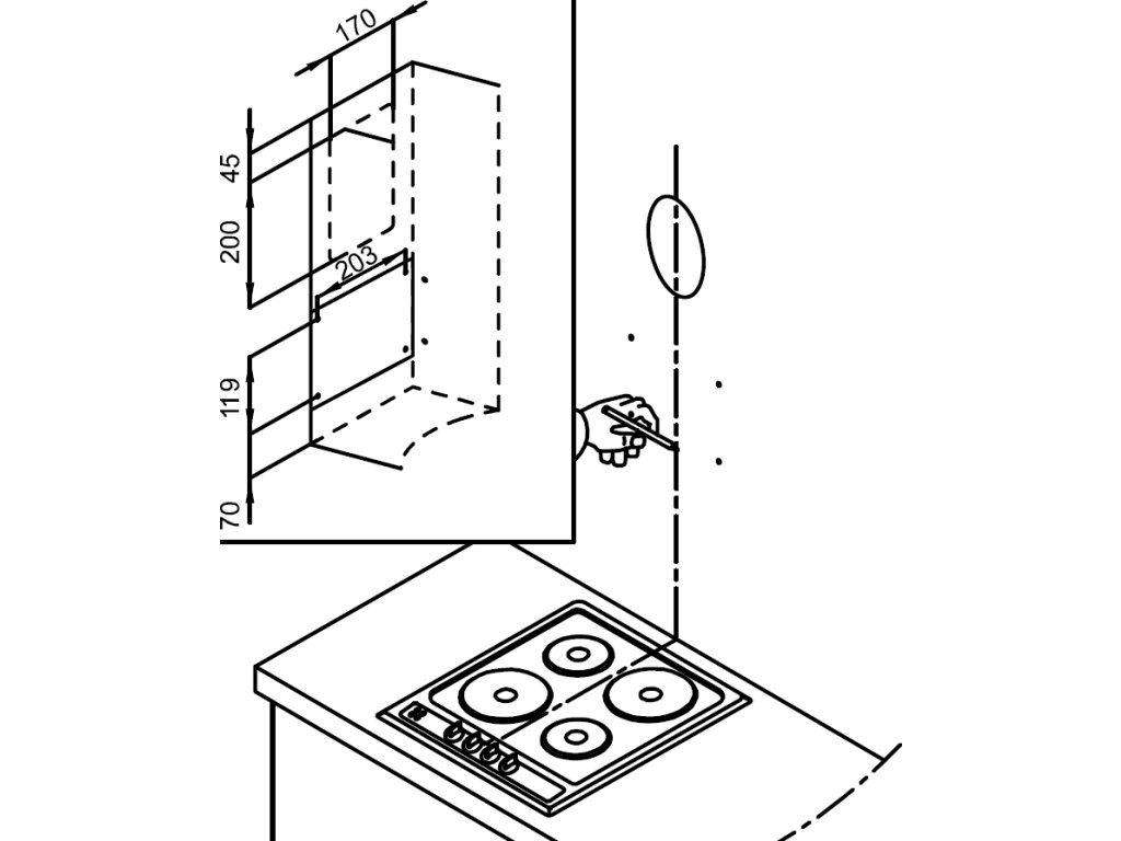 | Min. vzdálenost mezi odsavačem a elektrickou varnou deskou: | 55 cm |