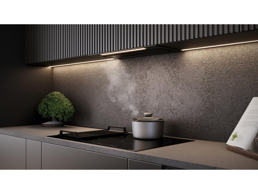 Tento odsavač par se pyšní stylovým černým designem, který elegantně kombinuje kov a sklo. Dotykové ovládání na skle je doplněno přehledným LED displejem, který zajišťuje jednoduché a intuitivní používání. Osvětlení pomocí LED proužku v přední části poskytuje jasné světlo nad pracovní plochou, což usnadňuje vaření za každých podmínek.