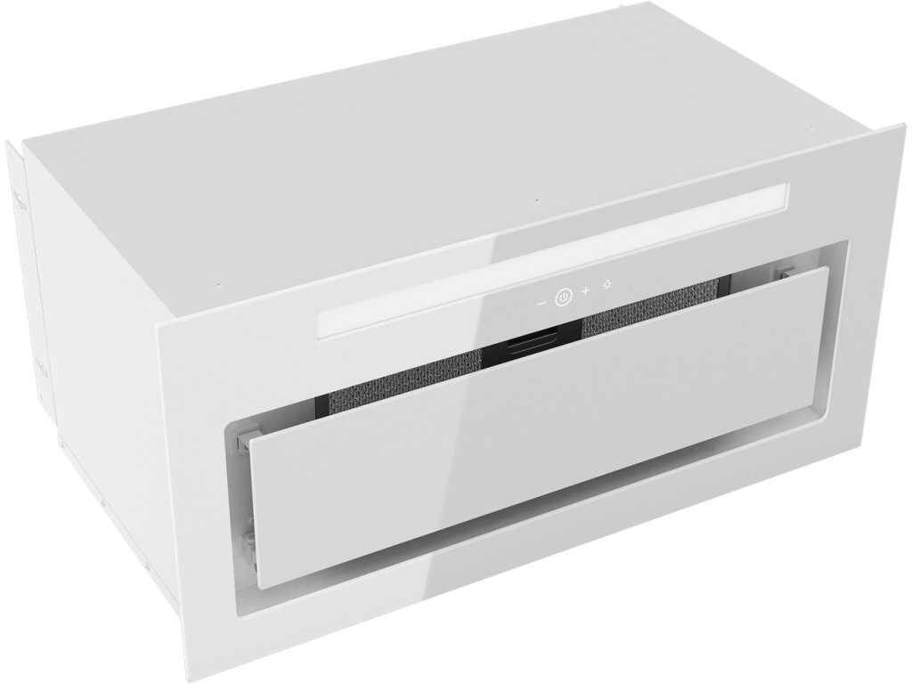 Tento odsavač par se pyšní moderním bílým designem, který elegantně kombinuje kov a sklo. Dotykové ovládání na skle je doplněno přehledným LED displejem, který zajišťuje jednoduché a intuitivní používání. Osvětlení pomocí LED proužku v přední části poskytuje jasné světlo nad pracovní plochou, což usnadňuje vaření za každých podmínek.