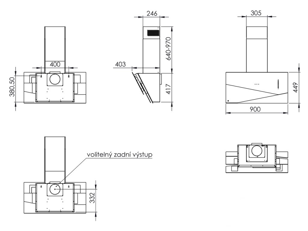 - Rozměry (ŠxHxV): 900 x 403 x 417 mm, výška komínu 640 - 970 mm