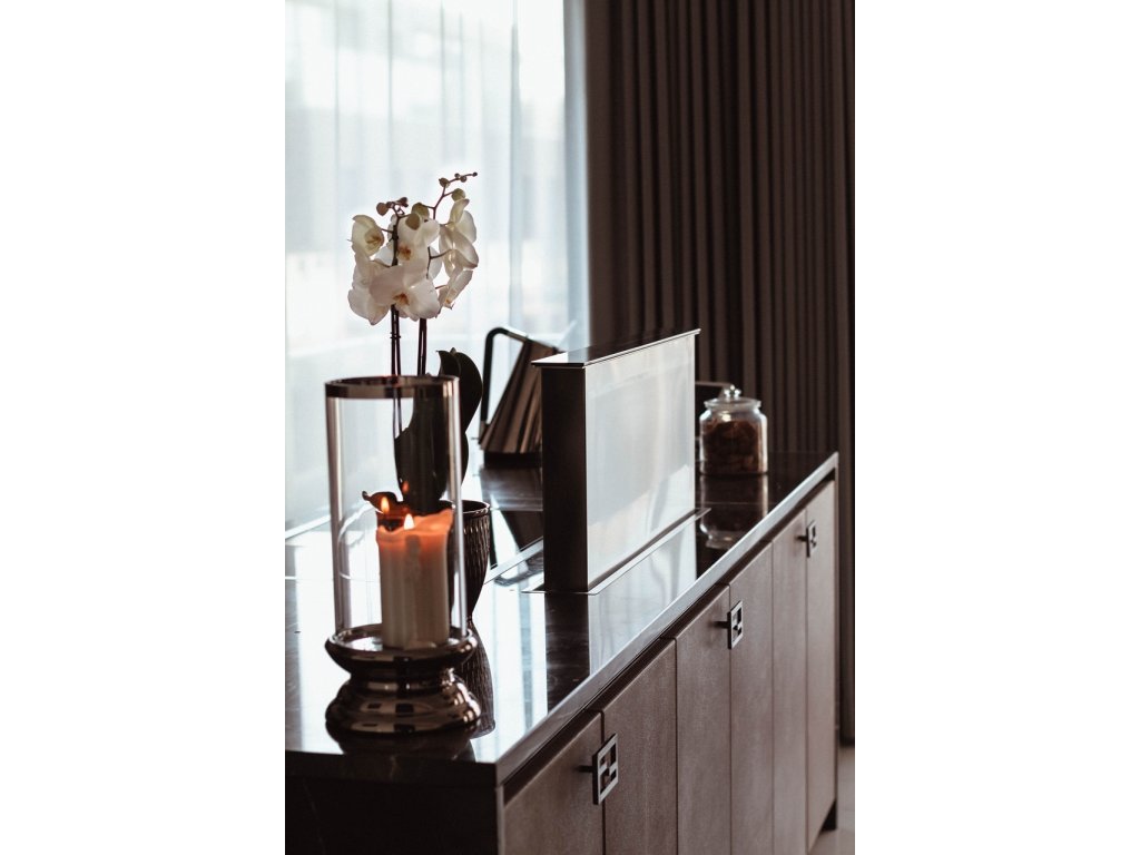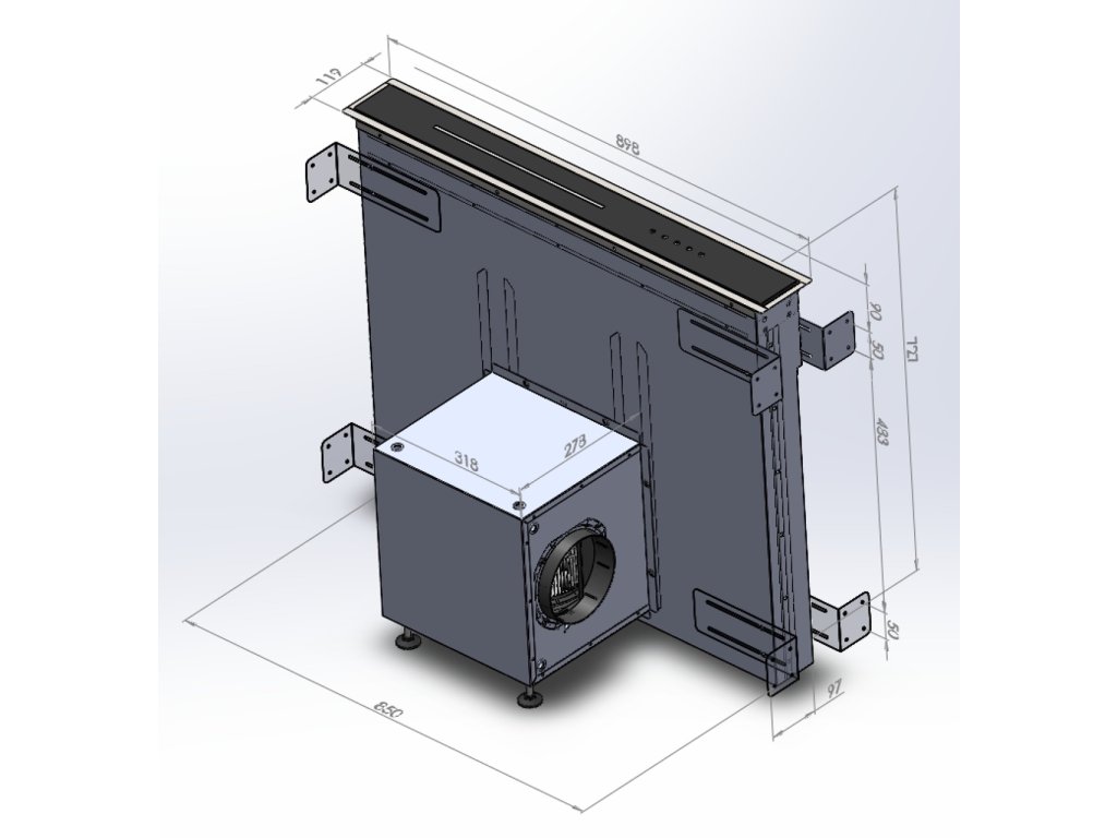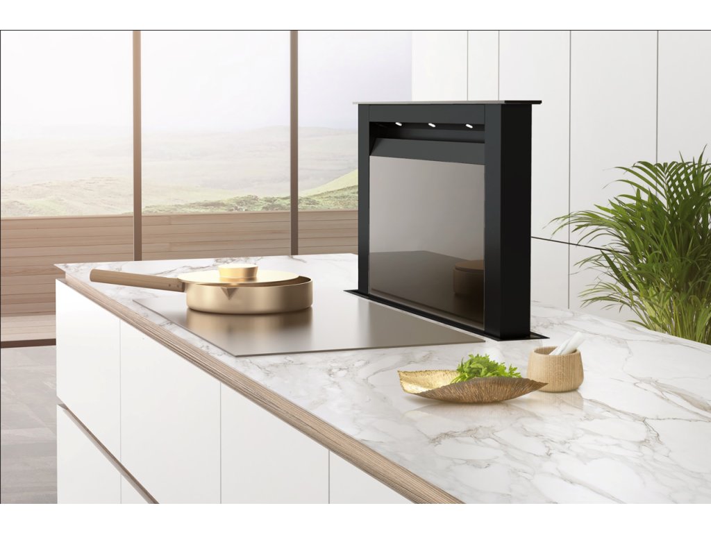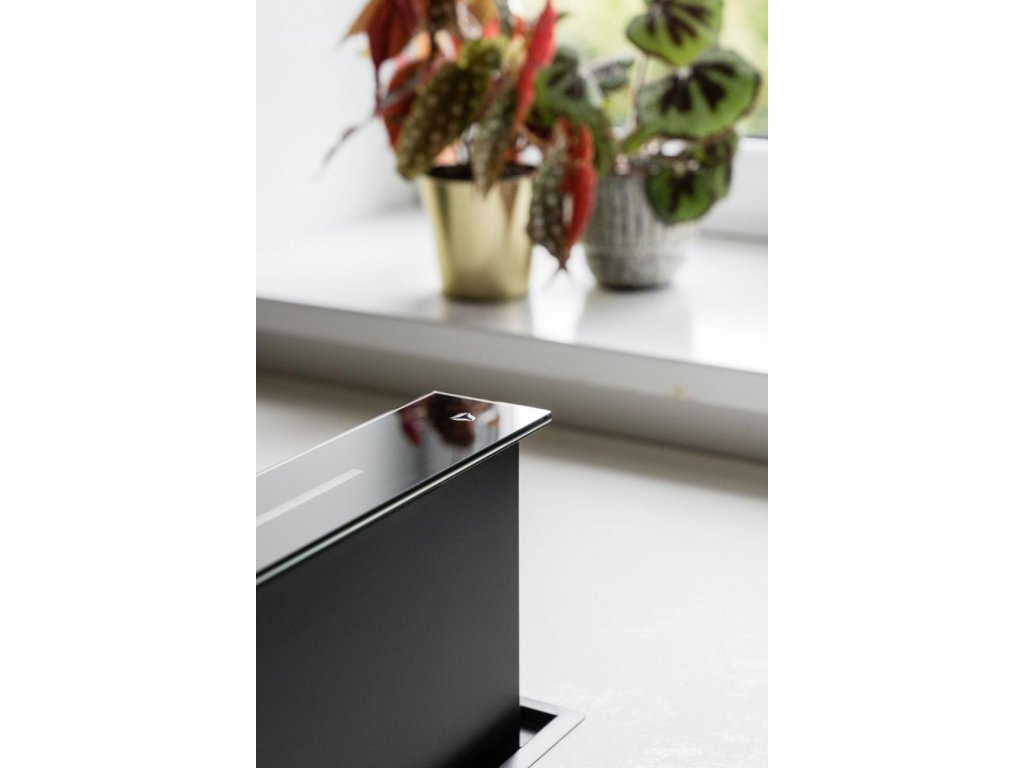 Matná černá povrchová úprava kombinovaná s černým sklem dává odsavači Moondraft Black moderní a luxusní vzhled. Plně výsuvný mechanismus umožňuje skrýt odsavač v pracovní desce, když ho nepoužíváte, a dotykové ovládání s LED displejem zajišťuje snadné a intuitivní použití. Navíc, pracovní výška výsuvu je libovolně nastavitelná v rozmezí 20-50 cm, což vám poskytuje flexibilitu podle vašich potřeb.