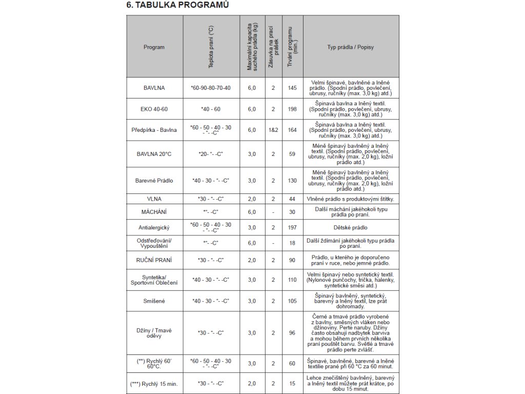 Programy praní: | Vlna, Ruční praní, Sportovní oděvy, Rychlý 15 min., Bavlna, Bavlna s předpírkou, Máchání, Bavlna 20°, Odstředění + vypouštění, Antialergický, Džíny / Tmavé oděvy, Rychlý 60', Barevné prádlo, Eco 40-60, Mix |