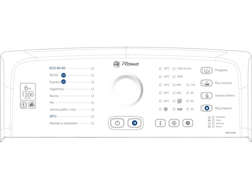 Romo RWT2260A disponuje funkcí odloženého startu o 3 až 12 hodin, zvukovou signalizací a autodiagnostikou poruch, což usnadňuje plánování praní a údržbu spotřebiče. LED indikátory zobrazují teplotu, rychlost odstřeďování, odložený start a zvolený program, čímž zajišťují maximální přehlednost. Tato pračka je ideálním řešením pro každou domácnost hledající spolehlivý a efektivní spotřebič pro každodenní praní.