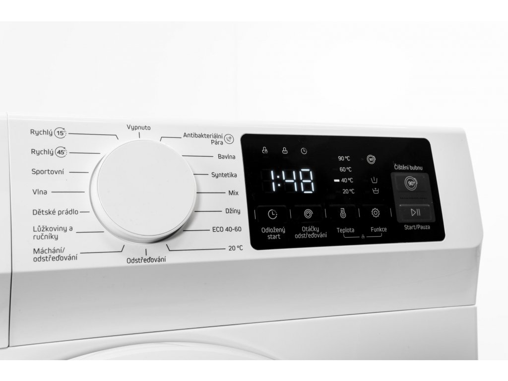 Uživatelský komfort zvyšuje přehledný bílý LCD displej a kombinace dotykového ovládání s pohodlným otočným voličem, umožňující snadný výběr z 15 různých programů. K dispozici jsou rychlé programy 45 a 15 minut, speciální antibakteriální program a mnoho dalších. Pračka také nabízí možnost odložení startu a užitečné funkce jako předpírka, přidané máchání a čištění bubnu. Antibakteriální parní program, kombinující prací cyklus s párou, proniká hluboko do vláken prádla, eliminuje zápach a chrání zdraví.