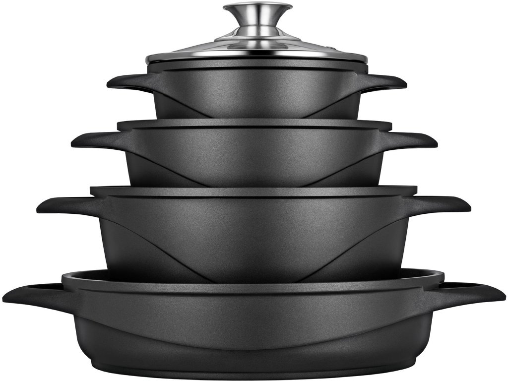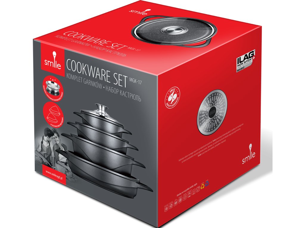 Sada nádobí KLUGE Smile MGK-17 se skládá ze 3 hrnců a kastrolu s pokličkami a 2 silikonových rukaviček usnadňujících práci v kuchyni.Hrnce včetně rukojetí jsou hliníkovým odlitkem s tlustým sendvičovým dnem. Vícevrstvé dno svým složením a konstrukcí zaručuje perfektní rovnoměrný rozvod tepla po celé ploše. Umožňuje ohřev všemi způsoby tj. na tradiční plotně, na plynu a na indukcích.