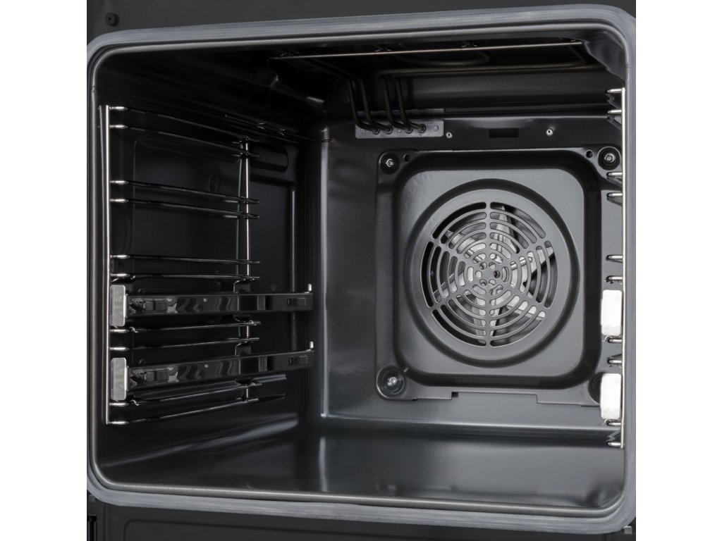 Ventilátor vhání do trouby vzduch ohřátý přes kruhové topné těleso.umožňuje péci více vrstev plechů, tedy i více než dvě. Při této funkci také nedochází k promíchání chutí a vůní jednotlivých vrstev.Litinové rošty