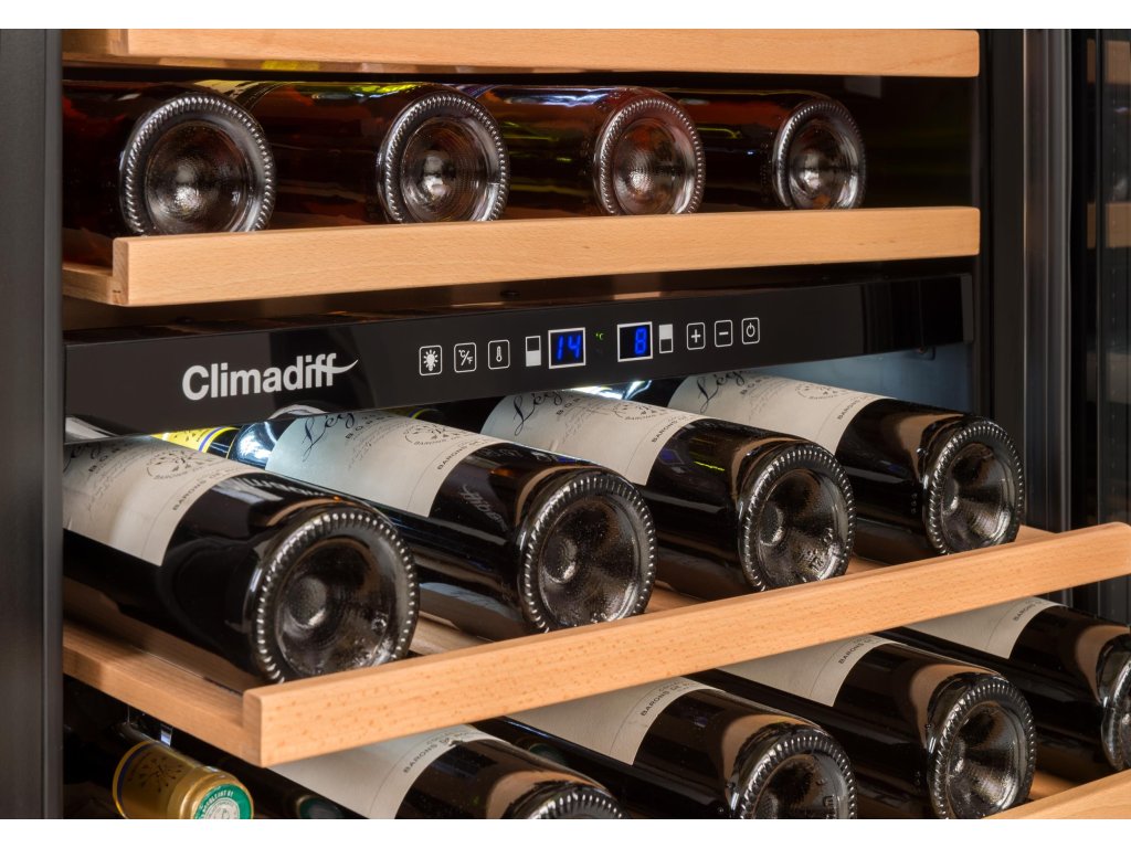 Vinotéka Climadiff CBU50D2B nabízí dvě nezávislé teplotní zóny, což umožňuje skladovat červená i bílá vína při jejich optimálních teplotách. Horní zóna udržuje teploty v rozmezí 5-12 °C, zatímco spodní zóna nabízí teploty mezi 12-20 °C. To znamená, že můžete mít připravena bílá vína i plná červená pro servírování v ideální kondici.