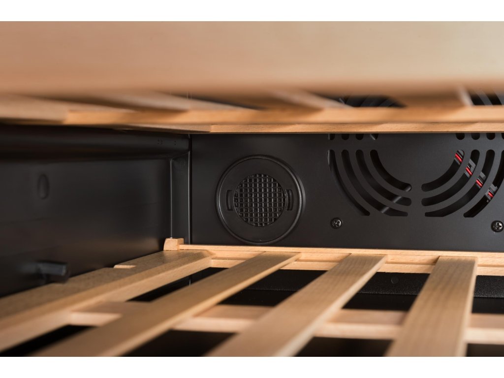 Vinotéka je vybavena šesti pevnými dřevěnými policemi z bukového dřeva, které nabízejí dostatek místa pro uskladnění až 51 lahví. Bílé LED osvětlení s vypínačem dodává interiéru vinotéky elegantní vzhled a umožňuje vám vytvořit příjemnou atmosféru, zatímco modrý digitální displej usnadňuje nastavení a kontrolu teploty.