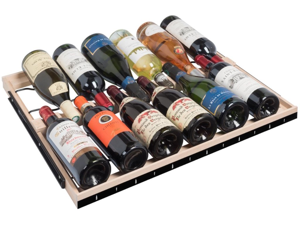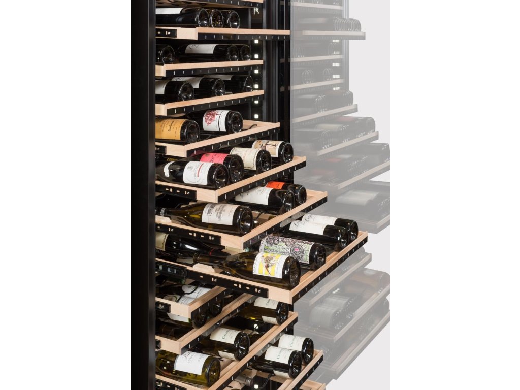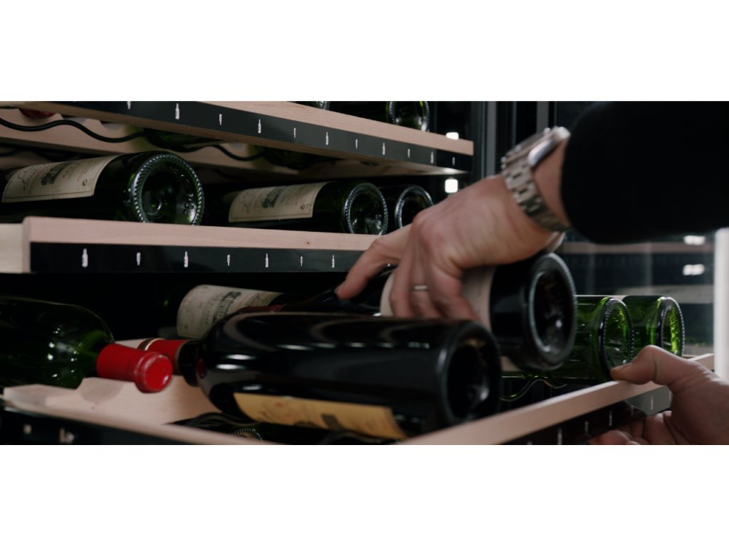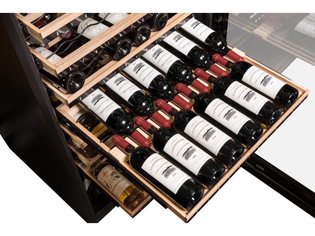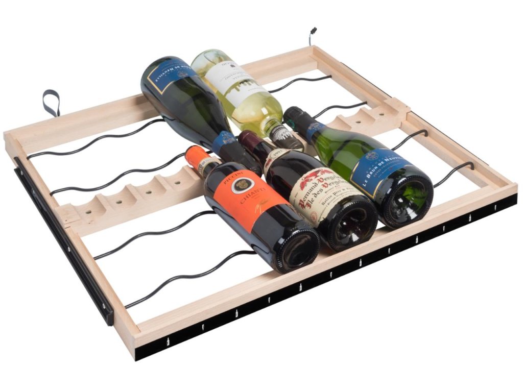 Vína můžete uskladnit na celkem 14 výsuvných dřevěných smart policích s LED indikací lahví. Snadnou manipulaci zajišťují 2 výškově stavitelné nožky a 2 zadní transportní kolečka.
