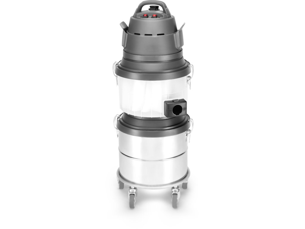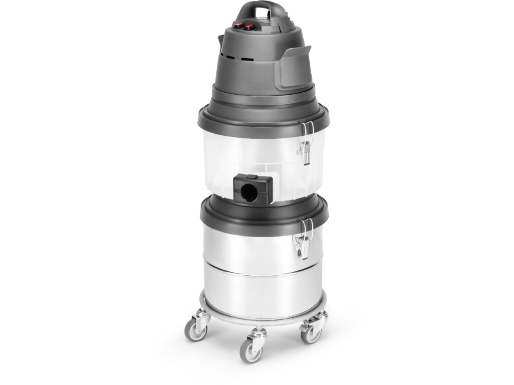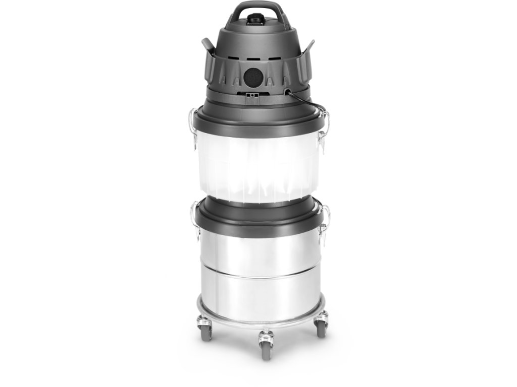 Vysavač má objemnou 30litrovou sběrnou nádobu vyrobenou z odolného nerezu. 5 kovových zátěžových ložiskových koleček osazených na kovových hřídelích se dobře pohybuje i po částečně nerovném terénu stavby nebo dílny. Jedno kolo je možné zablokovat brzdou a vysavač stabilizovat na místě. Pokud je vysavač v pohybu je díky 5 kolům velmi stabilní, ale taky velmi dobře manipulovatelný a přemístitelný.